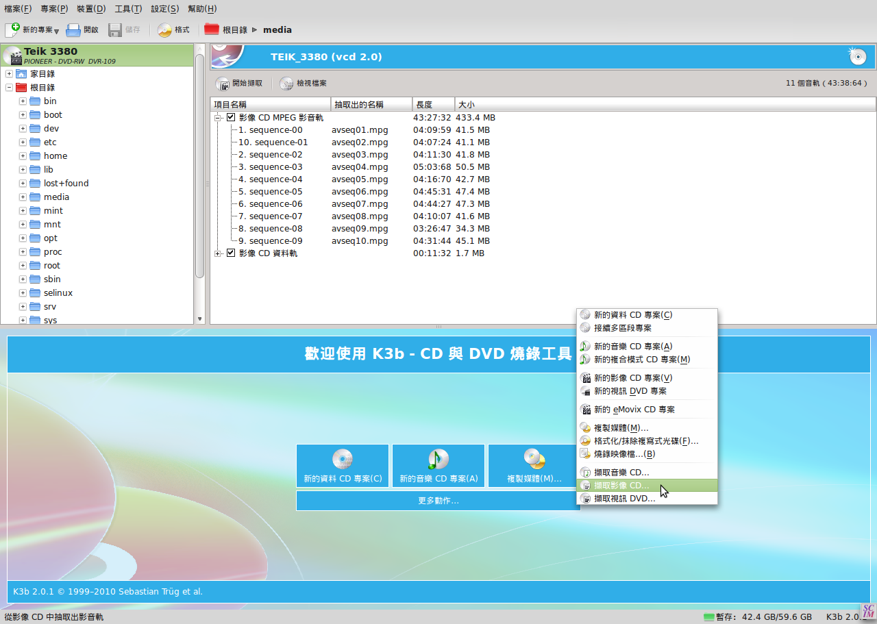 ps-2:如果要擷取光碟內的影像檔可以在套件管理員搜尋並安裝''vcdimager'' ,然後參考下圖動作即可擷取影像
